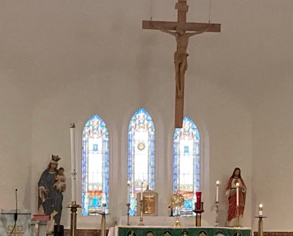 One of the things I did before that trip was to find out if a church along my way would have an hour of Eucharistic Adoration sometime when I was around. (When I’m on a multi-day hike I always keep one set of clothes reasonably clean for such occasions.) Yes! For that, I’m grateful to the community at All Saints Church in Lancaster, New Hampshire.